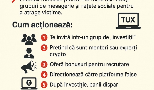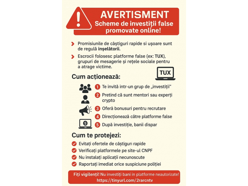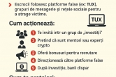 Promisiunile de câștiguri rapide și ușoare sunt, de regulă, înșelătorii. Îndemnăm cetățenii să fie extrem de vigilenți și să nu cadă pradă ofertelor de investiții false promovate pe internet, precum platforma TUX sau alte platforme similare.