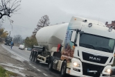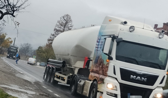 O fotografie. O mamă cu copilul în brațe, trecând grăbită printre două TIR-uri, la doar câțiva pași de trecerea de pietoni.