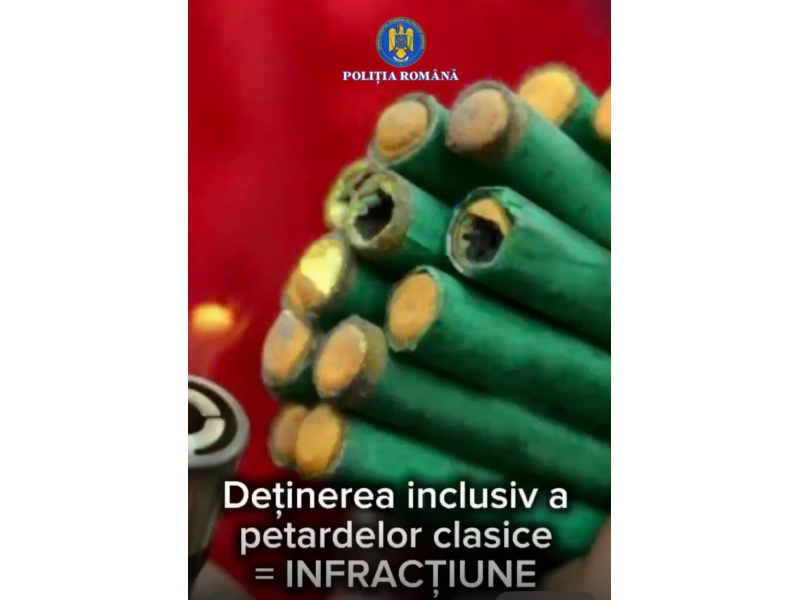 În perioada 22 septembrie 2025 - 05 ianuarie 2026, poliţiştii Serviciului Arme, Explozivi şi Substanţe Periculoase din cadrul Inspectoratului de Poliţie al Judeţului Neamț acţionează pentru prevenirea oricăror evenimente negative generate de nerespectarea legislaţiei privind obiectele pirotehnice şi pentru verificarea legalităţii operaţiunilor cu articole pirotehnice desfăşurate de persoanele fizice şi juridice.